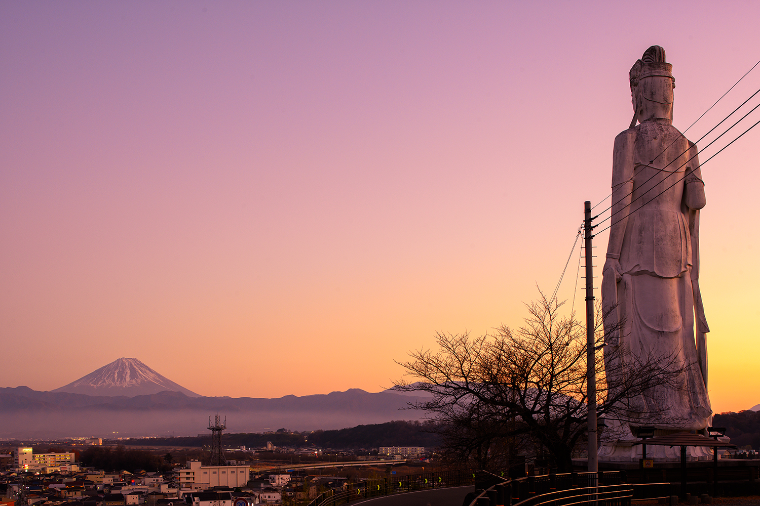 韮崎平和観音は韮崎駅の近傍、徒歩10分程の高台に位置する観音で、市内を一望する事のできる場所に建立されています。その平和観音付近からは富士山と共に韮崎市街を眺めることができます。